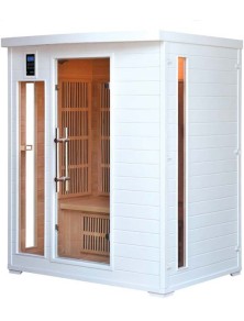 Sauna ad infrarossi 3 posti bianca con irradiatori in carbonio, temperatura massima di esercizio 65°, compresa di optional e esclusione timer fino a 4 ore.