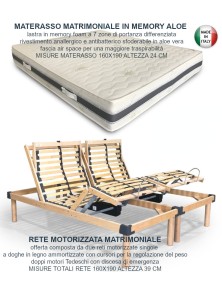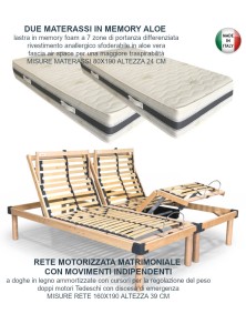 Rete elettrica motorizzata matrimoniale è composta da due reti singole sincronizzate a doghe ammortizzate in legno con motori Tedeschi telecomando wireless e un materasso ortopedico matrimoniale in memory con rivestimento sfoderabile in aloe vera e fascia traspirante air space, lastra in memory a 7 zone di portanza differenziata, altezza materasso 24 cm.