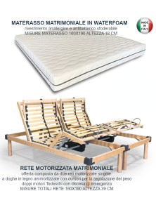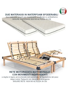 Rete matrimoniale motorizzata con materasso matrimoniale in memory. L'offerta è composta da due reti singole, con movimento sincronizzato, a doghe ammortizzate in legno con motori Tedeschi telecomando wireless senza fili e materasso matrimoniale ortopedico in memory a 5 zone di portanza differenziata con rivestimento anallergico e anti batterico sfoderabile, altezza 22 cm.