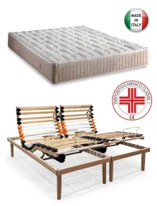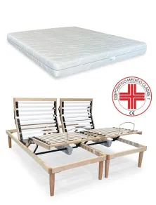 Rete matrimoniale motorizzata con due materassi singoli in memory, l'offerta è composta da due reti singole indipendenti a doghe ammortizzate in legno con motori Tedeschi telecomandi wireless senza fili e due materassi singoli ortopedici in memory a 5 zone di portanza differenziata con rivestimento anallergico e anti batterico sfoderabile, altezza 22 cm. Materasso dispositivo medico classe 1.