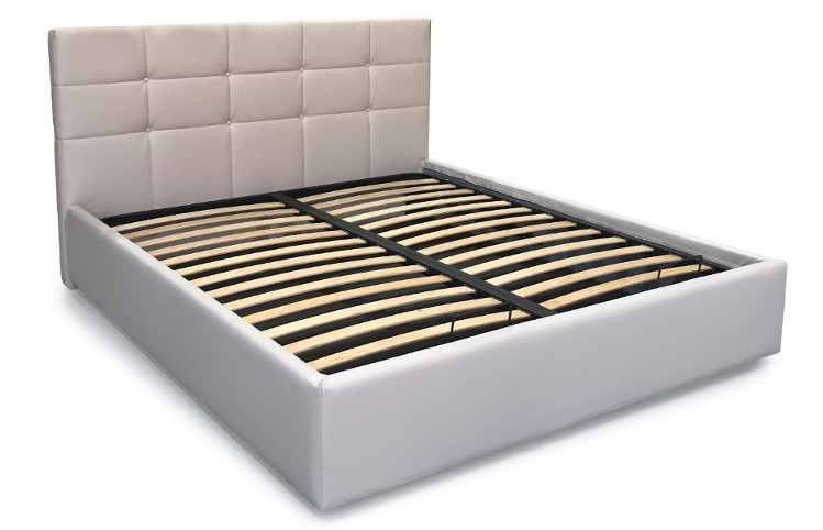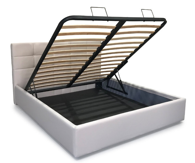 Pistoni a gas per movimentare la rete metallica con spessore 4,5 cm rete a doghe in legno con 13 doghe larghezza 6,5 cm spessore 1 cm, dotata di 2 ferma materassi per non far scivolare il materasso quando si alza la rete per accedere al contenitore.